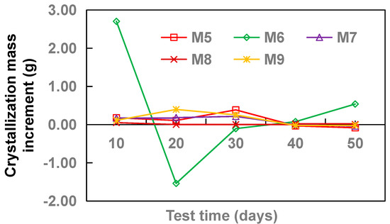 This group of experiments included nine kinds of pipe experiments. The pipe diameter of the drainage pipe was 32 mm and the flow rate was controlled to 34.5 cm·s−1. Among the pipes, M1–M4 were mainly the existing pipes, and M5–M9 mainly included the addition of other materials on the basis of the existing pipes, which changed the inner wall characteristics of the drainage pipe and the internal physical field of the drainage pipe, and analyzed the influence law of the drainage pipe material and structure on the crystallization of the drainage pipe. The variation law of crystallization quality of M1–M4 drainage pipes with test time is shown in Figure 9, and the variation curve of crystallization quality increment with test time is shown in Figure 10. The variation law of crystallization quality of M5–M9 drainage pipe with test time is shown in Figure 11. The variation curve of crystallization quality increment with test time is shown in Figure 12.