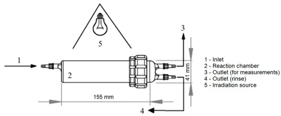 All the experiments were performed in the mini-photocatalytic wind tunnel (MPWT) reactor (Figure 1). The reactor is made of laboratory glass (DURAN®, Mainz, Germany) that transmits UV radiation larger than 305 nm. The custom-made reactor has a cylindrical geometry (D = 40 mm, L = 155 mm), and it was made from two parts for the easier insertion of a catalyst and potential scale-up. Furthermore, a photocatalyst was placed 7 cm from the lamp in the middle of the photoreactor and illuminated with the full-spectrum linear fluorescent lamps simulating solar spectra; high color rendering Ra98/Class 1A with a color temperature of 6700 K (Exo Terra Repti Glo 2.0 UVB, T8, 60 cm, nominal power 20 W, Holm, Germany). Such a setup ensures the isoactinic conditions on the surface of the photocatalyst.