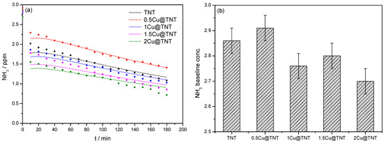As it can be seen in Figure 4, in 180 min under a UV/Vis irradiation, the maximum concentration of ammonia changed in the presence of different photocatalyst samples, i.e., the initial NH3 concentration in the MPWT reactor decreased by different values. To be specific, for the unmodified TNT sample, NH3 concentration decreased 20.8% in comparison to the baseline. As for the Cu-modified samples, the concentration decreased as follows: 0.5Cu@TNT 40.5%, 1Cu@TNT 41.3%, 1.5Cu@TNT 52.4%, and 2Cu@TNT 62.5%. The sample modified with 2 M Cu showed the highest efficiency for the NH3 removal in comparison to the other samples studied in this work.