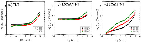 Conductivity spectra for selected samples measured under controlled relative humidity (30%, 75%, and 94%): (a) TNT, (b) 1.5Cu@TNT, (c) 2Cu@TNT.