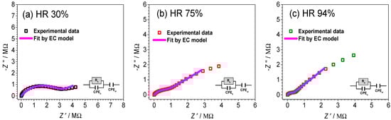 Complex impedance spectra for sample 2Cu@TNT measured at various relative humidity: (a) 30%, (b) 75%, and (c) 94%. The symbols (colored open squares) denote experimental values, whereas the solid magenta line corresponds to the best fit. The corresponding equivalent circuit model, comprised of multiple parallel combinations of the resistor (R) and the constant-phase element (CPE), used for fitting the data of an individual spectrum, and its interpretation is shown in each figure (defined as follows: b—bulk phase, and el—electrode polarization).