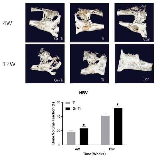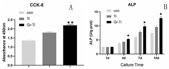 - Lu, J.; Sun, J.; Zou, D.; Song, J.; Yang, S. Graphene-Modified Titanium Surface Enhances Local Growth Factor Adsorption and Promotes Osteogenic Differentiation of Bone Marrow Stromal Cells. Front. Bioeng. Biotechnol. 2020, 8, 621788. [Google Scholar] [CrossRef] [PubMed]