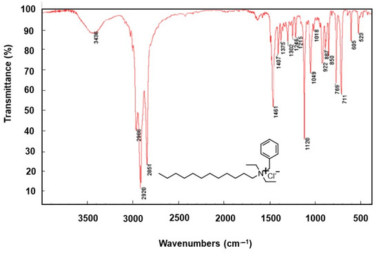 The IR spectroscopy characterization of the synthesized surfactants is shown in Figure 1. The bands located in the region from 1120 to 1018 cm−1 and from 850 to 750 cm−1 were assigned to asymmetrical and symmetrical stretching modes of C-N-C [27], whereas the bands at 2920 and 2851 cm−1 were attributed to the asymmetrical and symmetrical stretching mode of Csp3-H, respectively. Furthermore, the bands located at 711 cm−1 were attributed to (CH2)n rocking, and at 1246 cm−1 to CH3 symmetric bending and finally 1461 cm−1 to CH2 asymmetric bending. These infrared bands’ characteristics confirm the existence of linear alkane chain substituents in the synthesized surfactants. However, the bands located at 1615 and 922 cm−1 attributed to the stretching modes of C=C and C-H confirm the presence of alkene chain substituents in the molecular structure of prepared surfactants. The large band located at 3436 cm−1 was attributed to the stretching of O-H bending. All the prepared surfactants share the same functional groups and in turn the same chemical bonds.