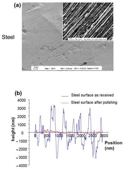 (a) FEGSEM images of the as-received steel and the insert corresponding to steel after polishing process; (b) the corresponding roughness.