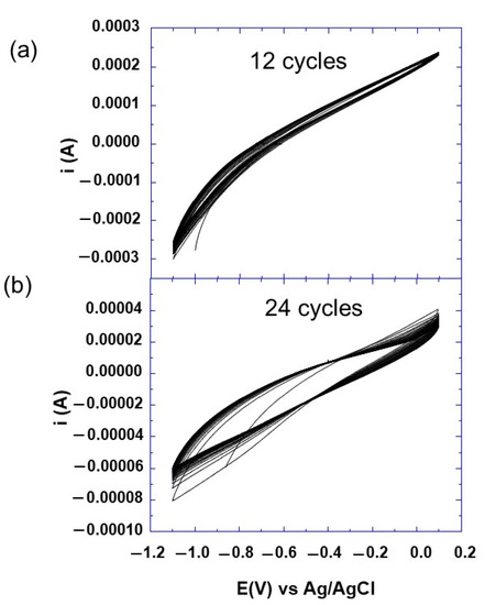 Cyclic voltammogram at scan rate of 10 mV/s of surfactant 5 during 12 (a) and 24 (b) voltammetry cycles as indicated.
