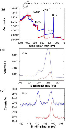 XPS spectra of the electrografted steel with surfactant 4 (blue color) and of bare steel (red color): (a) the survey, (b) the C1s core level and (c) the N1s core level.