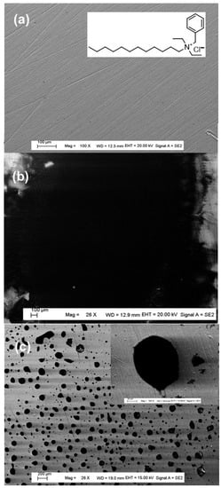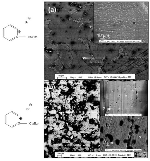 Further confirmation of the surfactants’ electrografting success was provided by the FEGSEM characterization. It can be observed from Figure 5 that the surface strip’s structure observed after the polishing process disappears after the grafting process, when the black domains appear on the surface. This confirms the adsorption of surfactants layer on the steel electrodes surface, which completely hid the underlying strips’ structure (insert Figure 5a,b). Furthermore, the effectiveness of the prepared inhibitor thin film depends on the length and structure of the carbon chain of the organic molecule grafted onto the electrode surface, as well as the electrografting conditions [28].
