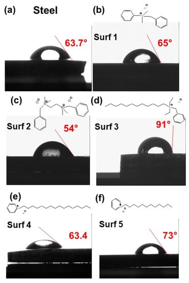 In order to provide additional confirmation of surfactants electrografting success, the wetting properties of the grafted steel with synthesized surfactants were investigated, and the corresponding water contact angle measurements were conducted. The obtained results are reported on Figure 6, and it can be observed that there are variations of the contact angle after the steel surface grafting. After polishing, the bare steel electrode exhibits hydrophilic behavior with a contact angle near 63.7°. After the grafting process, the water contact angles of the modified steel electrodes increase to between 70° and 90°, with hydrophobic behavior for surfactant 3. The change in contact angle is well known to confirm the efficiency of the grafting process and the formation of surfactant thin films.