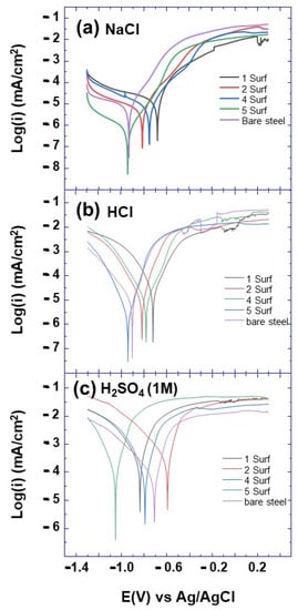 As evidenced from Figure 8, surfactant 3 shows the best anticorrosion efficiency in different aggressive media, among the grafted layer from the other surfactants. In addition, it can be noted that the anticorrosion efficiency of surfactant 3 layer is effective in HCl, H2SO4 and NaCl aggressive solutions. Furthermore, it can be observed that the corrosion current decreases compared to bare steel in HCl solution and the corrosion potential shifts to more positive potentials, with the number of electrografting cycles and surfactant concentration. This suggests the enhancement of the anticorrosion efficiency of the surfactant 3 grafted layer, with the number of electrografting cycles, which could be explained by the increase in surfactant molecules grafted on the surface of steel substrate.