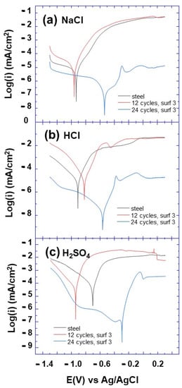 Polarization curves of bare and electrografted steel with different surfactants and in different media (a) NaCl, (b) HCl and (c) H2SO4, after 12 voltammetry cycles as indicated.
