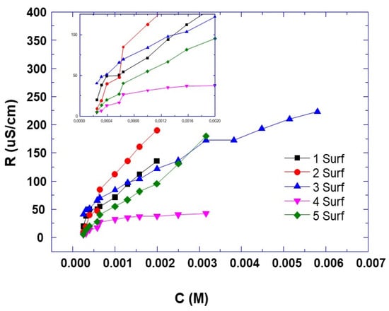 To better understand the observed behaviors, we considered the assembly of surfactants into micelles [37], and we plotted the conductivity versus different concentrations for each surfactant. From these curves, we can deduce the critical micellar concentration of each surfactant, which is the intersection of the two linear behaviors of the conductivity versus the concentrations [37].