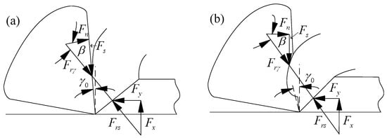 In order to understand the cutting mechanism of Tools A and B, Figure 4 shows the chip force diagram of Tools A and B in the cutting process. Frγ and Frs are a pair of balance forces, where Frγ is the force of the tool on the chip, which can be decomposed into the positive pressure Fn and friction force Ff of the tool on the chip, and Frs is the force of the workpiece on the chip, which can be decomposed into the horizontal force Fy and vertical force Fx of the workpiece on the chip.