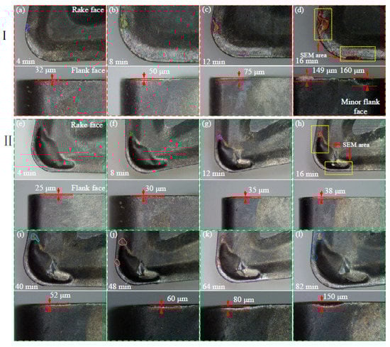 Figure 5 shows images of the change in the wear topography of the rake and flank faces of Tools A and B. It can be seen from Figure 5 that the wear of the main cutting edge and the auxiliary cutting edge near the rake face of Tool A increased rapidly with the cutting time. The material near the main cutting edge peeled off from 12 to 16 min, forming obvious crater wear. Crater wear started from 4 min near the auxiliary cutting edge. Due to the high-speed chip flow through the surface near the auxiliary cutting edge, serious friction occurred, and the material on the tool surface was taken away quickly, forming serious crater wear. The crater wear proportion was largest when cutting at 16 min. From 4 to 16 min, the wear width of flank face of Tool A increased rapidly from 32 to 149 μm. When the cutting time reached 16 min, the wear width near the auxiliary flank reached 160 μm due to serious crack wear near the auxiliary cutting edge. However, Tool B cut for a total of 82 min, and its service life was 5 times higher than that of Tool A. As can be seen from Figure 5, from 4 to 48 min, the rake face wear near the main and auxiliary cutting edges of the rake face of Tool B shows little change. When the cutting time reached 64 min, the rake face pit wear increased rapidly, and when the cutting time reached 82 min, the pit wear reached the maximum. The wear width of Tool B flank increases slowly from 4 to 82 min, and the wear width increases from 25 to 150 μm.