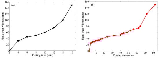 (a) The flank face wear curve of the Tool A. (b) The flank face wear curve of the Tool B.