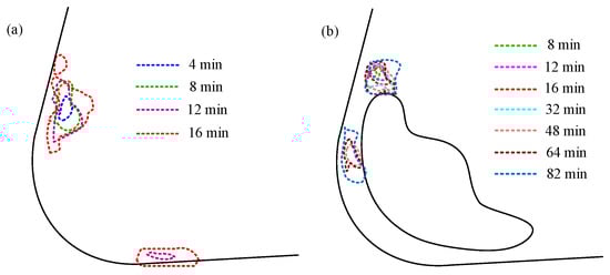 As can be seen from Figure 7a, from 4 to 16 min, the crater wear area of the auxiliary cutting edge of Tool A pair increased rapidly with time, and the change rate of the crater wear area was high. Crater wear near the main cutting edge mainly occurred between 12 and 16 min. Because the temperature of Tool A increased rapidly with the cutting time, the strength and chip breaking ability of Tool A decreased because of the thermal softening effect. When high-temperature chips flew out from the rake surface, the field near the auxiliary cutting edge was severely rubbed, and the crater wear area increased rapidly. As can be seen from Figure 7b, due to the insertion of the micro-groove on the rake face of Tool B, the contact area of Tool B chips was small, the temperature growth of Tool B was small and the crater wear near the auxiliary cutting edge was slow. Furthermore, the wear area was smaller, and no crater wear occurred near the main cutting edge. Compared with Tool A, the crater wear area near the auxiliary cutting edge of Tool B was divided into two parts due to the existence of the micro-groove, and the wear area was greatly reduced.