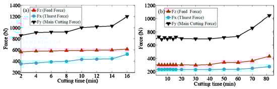 The three-way cutting forces during the cutting process were measured using a Kistler-9257-B. We repeated three cutting durability experiments. As shown in Table 5, the numerical discrete value of the cutting force of the three experiments was within a reasonable range, and the data was reliable. The average values were taken as the data presented in the paper.