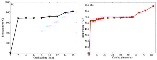 It can be seen from the Figure 8 that Tool A only cut for 16 min, and the three-way cutting forces of Tool B at the corresponding time point was less than that of Tool A, with a reduction of more than 20%. When the cutting time was 10 min, the main cutting force Fy of Tool B decreased by 24.7%, the cutting depth resistance force Fx decreased by 32.5% and the feed resistance force Fz decreased by 38.3%. After cutting for 60 min, the main cutting force of Tool B greatly increased. During the cutting process, the cutting temperature was measured by an infrared thermometer, as shown in Figure 9. It can be seen from the figure that comparing Tool A with Tool B between 0 and 16 min, temperatures decreased by more than 20%. When the cutting time was 10 min, the cutter tip temperatures of Tools A and B were 723.2 and 566.8 °C, respectively, and the cutter tip temperature of Tool B was decreased by 21.63%. When the cutting time exceeded 60 min, the cutting temperature rapidly increased, and when the cutting time reached 82 min, the cutting temperature reached 785.8 °C.