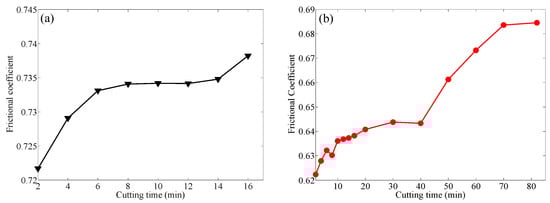 (a) Changes in Tool A frictional coefficient with time. (b) Changes in Tool B frictional coefficient with time.