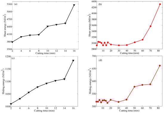 The friction coefficient, shear energy and sliding energy of Tool A and Tool B in the cutting process were calculated by measuring the cutting force in the three directions of the tool combined with the tool parameters in Table 1 and Equations (1)–(9). As shown in Figure 10a,b, during the cutting process, the friction coefficient of the cutting chip of Tool B was always lower than that of Tool A. The maximum friction coefficient of Tool B was 0.685, and the lowest friction coefficient of Tool A was 0.722. It can be seen from Figure 11a–d that when the cutting time was from 2 min to 16 min, the shear energy of Tool A was from 3785.2 to 5266.3 MJ/m3; at the same time frame, the shear energy of Tool B was greatly decreased. The sliding energy of Tool A was increased from 1009.9 to 1193.4 MJ/m3, and the friction energy of Tool B was decreased by more than 40% at the same moment. It can be seen from Figure 8 that the three-dimensional cutting forces of Tool B were greatly reduced compared to Tool A, and the inputs of shear energy and sliding energy of Tool B were less.
