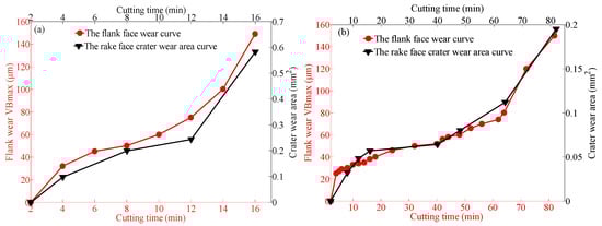 We can compare the flank wear curve with the crater wear area curve of the rake face of Tool A and Tool B, as shown in Figure 12. For Tool A and Tool B, the two curves have sufficient consistency. It can be seen from Figure 12a that when Tool A was cutting for 0–4 min, the wear was in the initial stage, and the wear width of the flank increased rapidly. At the same time, the crater wear area increased rapidly. After 4–14 min, it was in a stable change stage, and the crater wear changed slowly. When the cutting exceeded 14 min, it was in the rapid increase stage—the flank wear width was intensified and the crater wear area also showeda rapid increase. For Figure 12b, when cutting for 0–4 min for Tool B, both the flank wear width and the crater wear area increased rapidly. When the cutting time was 4–64 min, the flank wear was in a stable change stage, and the crater wear area changed gently. From 64 to 82 min, the flank wear width and crater wear area were in a state of aggravation. In general, Tool A had larger crater wear area and a higher change rate.
