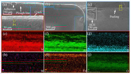 (a–d) The flank face wear of Tool B after 82 min of cutting. (e–j) Distribution of elements.