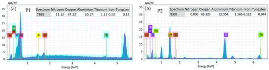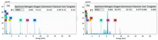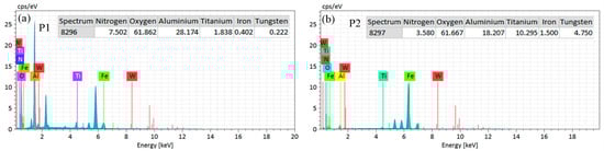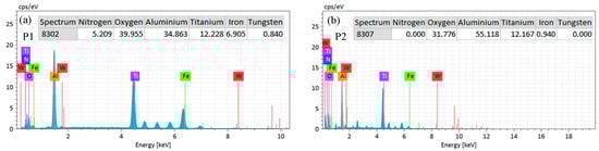 Similarly, the severe wear area on the flank face was selected as the scanning point, and the analysis was conducted by the energy spectrum. As shown in Figure 19 and Figure 20, the O contents of Point P1 and P2 of Tool A are 73.12% and 65.971%, respectively, while the corresponding points of Tool B are only 39.955% and 31.776%, respectively, indicating that the oxidation wear of Tool A was more serious in this area, while the Fe contents of Tools A and B were relatively close.