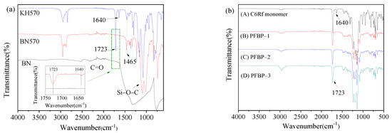 (a) FTIR spectra of KH570, BN570, and BN, inset is the enlargement of rectangle; (b) ATR-IR spectra of C6Rf monomer (A), PFBP-1 (B), PFBP-2 (C) and PFBP-3 (D).