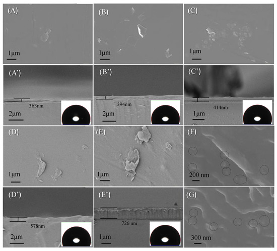 SEM images of top-view (A–E) and cross-section (A’–E’) of PFBP coatings prepared from different coating solutions. (A,A’) 1 wt.% PFBP-1 coating solution; (B,B’) 1 wt.% PFBP-2 coating solution; (C,C’) 1 wt.% PFBP-3 coating solution; (D,D’) 2.5 wt.% PFBP-2 coating solution; (E,E’) 5 wt.% PFBP-2 coating solution. Insets are photographs of water drop on the corresponding coatings; and cross section images of coating slices (F,G). The slices were prepared by embedding coatings in Technovit®7100.