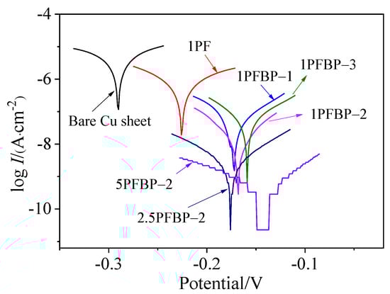 Electrochemical polarization is a conventional method to evaluate the corrosion resistance of coatings. A lower self-corrosion current density (Icorr) means a slower corrosion rate. As shown in Figure 4, the Tafel curve of the PF coated Cu sheet evidently shifts to the lower right corner, compared to that of the bare Cu sheet. This indicates that coating with fluorinated polymer greatly improves the corrosion resistance. PF coating with good hydrophobicity prevents the corrosive medium (3.5 wt.% NaCl aqueous electrolyte) from contacting the Cu substrate and thus inhibits the corrosion. By contrast, the Tafel curves of the BN incorporated PFBP coatings are positioned lower than that of the PF coating, which means that PFBP coatings display better corrosion resistance than the PF coating. When increasing the thickness of the coatings by using higher concentration coating solution, the Tafel curves further move to a lower position, implying the achievement of better corrosion resistance performance. Corrosion data fitted from the Tafel curves are collected in Table 1. Icorr of PFBP-1, PFBP-2 and PFBP-3 coatings are remarkably decreased to be 0.05, 0.018 and 0.074 μA·cm−2, respectively, much lower than that of bare Cu sheet and PF. It is also observed that all of the PFBP coating samples exhibit a maximum corrosion rate lower than 8.6 mm·year−1, much slower than that for PF coating. Additionally, corrosion potential (Ecorr) also indicates the corrosion trend. The more positive the Ecorr is, the more difficult the corrosion inclines to be. The Tafel curves for the PFBP-coated Cu sheet give an Ecorr higher than −171 mV, more positive than for bare Cu sheet and PF at −290 and −226 mV, respectively. Among the PFBP-2 coatings with different thickness, it can be observed that 5PFBP-2 shows the best corrosion resistance. The Icorr for 5PFBP-2 is 0.4 nA·cm−2, which decreases two orders of magnitude compared to the 1PFBP-2.