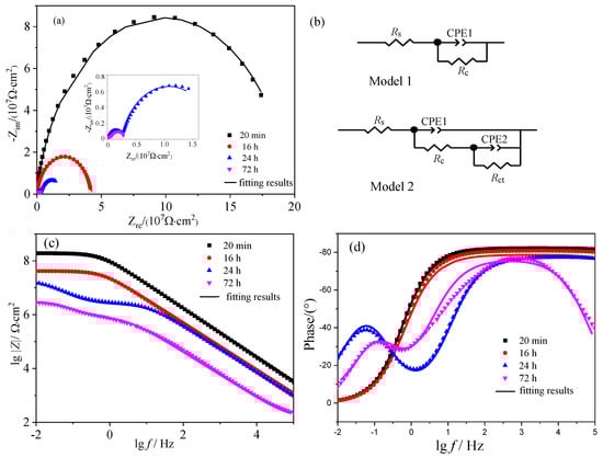 The electrochemistry corrosion behavior of the 5PFBP-2 coating is further investigated by analyzing the EIS data acquired through immersing the samples in 3.5 wt.% NaCl solution for 20 min, 16 h, 24 h, and 72 h, respectively, and the results are shown in Figure 5. After 16 h of immersion, the impedance of the 5PFBP-2 coated sample declines a little but the shape of Bode plots does not change and still keeps one time constant. Therefore, the curves can be fitted by the equivalent circuit model in Figure 5b. This indicated that the composite coating was effective in protecting the metal substrate from corrosion after even 16 h of immersion. With a prolonged immersion time of 24 h, two time constants appeared in the phase angle diagram and no longer conformed to the aforementioned equivalent circuit. Instead, the equivalent circuit model 2 in Figure 5b was used for fitting. The time constant at high frequency corresponds to the barrier performance of the coating [14,32], while the occurrence of one at low frequency indicates that the metal substrate has a corrosion reaction due to the infiltration of the corrosion medium [33,34]. Here, Rct is the charge transfer resistance between the substrate and the electrolyte, CPE2 is the constant phase angle elements representing capacitive properties of the electric double layer. It can be seen that the EIS data are well fitted by the models. The fitted data are collected in Table S2. After 72 h of immersion, the Rc of the coating decreased by near three orders of magnitude compared to the one immersed for 20 min (Figure S1), indicating that the electrolyte penetrates across the coating and corrodes the metal substrate.