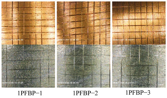 Adhesion test was performed on two different substrates coated with three coatings of 1PFBP-1, 1PFBP-2 and 1PFBP-3, respectively. The micrographs of coatings after hundred cell tests are shown in Figure 9. It can be seen that the scratch edges of the cut are smooth and no shedding is observed, which can be classified to be 5B grade according to ASTM 3359 [28]. This indicates that the PFBP coatings show good adhesion property. The fluorous coating solution features very low surface tension and can achieve good wetting of the substrate. The C=O bond linked to the C–C main chain of the acrylate polymer intensifies the adsorption forces due to the Keesom’s dipole effect, Debye’s induced dipole effect and London’s dispersion effect [40]. By virtue of the good adhesion of the acrylate polymer matrix, the PFBP coatings show excellent adhesion properties.