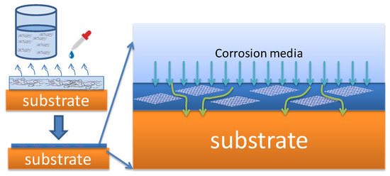 As illustrated in Scheme 2, the coating solution containing well-dispersed BN-fluorinated poly methacrylate composites can be facilely coated on substrate. After evaporation of the solvent, dense film forms which consists of BN flakes in the polymer matrix. In the case of bare substrate, electrochemical corrosion easily happens when the corrosion media directly contacts the substrate. The hydrophobic fluorinated poly methacrylate could separate the corrosion media from the substrate and thus delays the corrosion. For the coating of BN-fluorinated poly methacrylate composite, the combination of acrylated BN flakes and fluorinated acrylate through the in situ copolymerization, on one hand, improves the dispersion of BN flakes in the coating solution; on the other hand, it eliminates the voids between BN flakes and the polymer matrix. As a result, the penetration of the corrosion media from the coating film is greatly reduced and the labyrinth effect is intensified, compared to the composite coatings prepared by the physical incorporation of BN flakes [41].