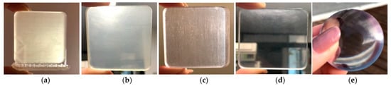 Slabs of t~1 cm thickness (a–d) of transparent Standard Clear (SC) resin without (a) and with (b) manual polishing and VeroClear (VC) resin without (c) and with (d) polishing. Slight browning of the SC sample is observed, partially removed by polishing, suggesting surface oxidation occurred during printing. By fluorinating such polymers, this oxidation and subsequent scatter can be largely avoided; alternatively, an inert atmosphere or vacuum can be introduced. A typical convex lens made of C is shown in (e) where significant surface Fresnel reflections are seen.