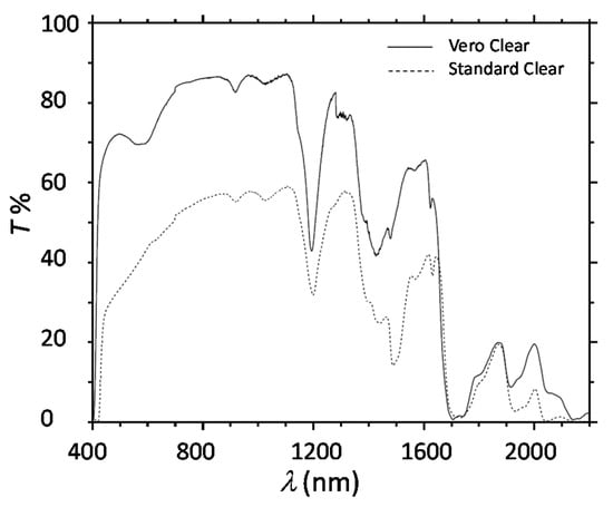 The VC samples were printed by the PolyJet printer (J750, Stratys, Eden Prairie, MN, USA), where a layer of photopolymer was sprayed onto a surface using an array of printhead nozzles, enabling high-resolution layers (16 μm) to be optically flash-cured by a UV LED lamp (proprietary, but VeroClear absorbs both ~λ = 380 and 405 nm [18], Stratys, Eden Prairie, MN, USA) as the material came out in a desired pattern. Thus, it differs substantially in approach but otherwise a similar photopolymerisation mechanism is involved.