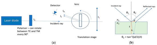 Optical setup (a) for measuring refractive index. Using equation in (b), angles are worked out and the refractive index calculated using Snell’s law. By taking the front, IF, and back, IB, reflections and measuring distance between front and back reflected rays, d, as a function of a number of angles, θ1 and θ2, error in calculating n from Snell’s equation, potentially arising from positional inaccuracy during alignment and non-parallel surfaces, can be reduced by taking single measurements.