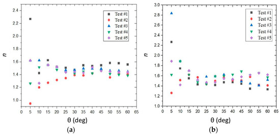 Refractive index, n, for (a) VC and (b) SC extracted five times in different places over the material as a function of calculated angle, θ. When the experiment works as it should, the profile is flat over the central angular region, quickly allowing an assessment of quality of measurement with meaningful error arising from its distribution. When the experiment is not well-aligned or the flats are not parallel, the flatness window quickly narrows. Importantly, measuring at 0° reveals how sensitive the measurement is when performing simple orthogonal measurements, providing a reason for significant variation in the literature. It likely arises from accurate differing alignment and beam discernment, including when passing through a splitter.