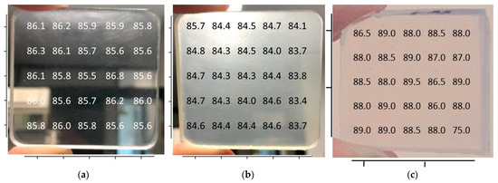Hardness is of interest in this work since it equates with durability and potentially higher optical damage thresholds—the coating protects the layers from oxidation (browning), reduces surface defect optical interactions and potentially compresses the polymer to raise its damage threshold, all essential aspects for increasing operational performance and longevity of the components in harsh environments. Consequently, Shore D hardness testing was repeated to see if the adherence was reflected as a localized strain-induced compression on the surface, hypothesizing that this would typically characterise well-attached film layers. The testing against the uncoated sample produced similar results to those shown in Figure 5b. The durometer reading for the coated sample (Figure 5c) revealed a significantly higher value D(SC)coated~88.1 ± 1.6 consistent with improved composite hardness at the interface between polymer and dielectric coatings. The outlier at the corner can be explained by noting that this corner is where the two cuts of this piece were made, relaxing the film structure. The results demonstrate that adding a coating layer to the SC sample improves its hardness, surpassing that of VC and therefore potentially negating some of its advantages over SC.