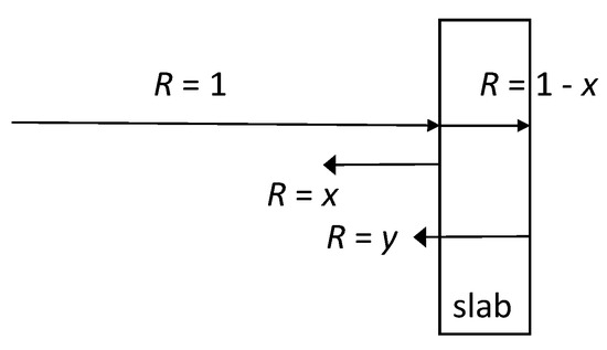 Schematic illustration of normalised Fresnel reflections from the front and back faces of the slabs, where x = y/(1 − x) if reflection is assumed identical at both faces. Differences in expected intensity are represented by x and y.