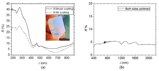 (a) Measured reflection of SC sample with and without anti-reflection coating of TiO2/MgF2. Inset image shows the sample with the coating—the thin film looks opaque away from orthogonal incidence. Significant suppression of Fresnel reflections are observed, including below the band-edge in the UV. The maximum observed drop is~λ = 680 nm at the red/near IR edge. Inset shows the coated sample; (b) Measured VIS-NIR reflection after both sides of the VC sample were polished, demonstrating significant scattered light as function of wavelength without a coating in the SC sample. The VC reflection is close to wavelength-independent except where some absorption (C–F) within the sample occurs.
