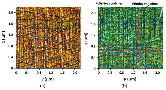 Surface profile maps over an area A~5 μm2: (a) sample SC before coating and (b) after coating. The almost regular vertical lines are from printing whilst the haphazard solid lines are scratches arising from polishing. The colour line scans are where cross-sectional profiles at various places were taken. From these, the average roughness, Ra, was calculated to be, before coating, Ra(BC) = (0.170 ± 0.037) μm and after coating, Ra(AC) = (0.153 ± 0.016) μm.