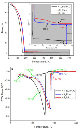 In addition to the dispersion characteristics and the methods and modes of deposition of layers, the determining factor for forming homogeneous uniform films is the procedure of their temperature treatment (drying and annealing). In order to correctly set the parameters of the temperature treatment of the layers and reveal the process of the film formation, a TG analysis of dispersions N1, N3, and N5 was carried out. The TG and DTG data are presented in Figure 3A,B, respectively.
