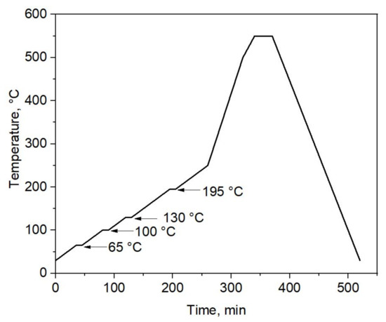 Based on the ongoing processes, the presented thermogram can be divided into four ranges. In the temperature range from 30 to 100 °C, including 10 min stabilization shelves at 65 and 100 °C, the process of water evaporation prevails. In the second temperature range (from 100 to 195 °C) with stabilization shelves at 130 and 195 °C, the evaporation of EG/H2O solution and other volatile composites occurs, and the TiO2-supported Au reduction processes continues. In the third temperature range (from 195 to 550 °C with a 30 min shelf at 550 °C), the final removal of volatile residues and the formation and annealing of the TiO2 matrix with embedded AuNPs is completed. Note that the entire temperature treatment process of the films was carried out with continuous blowing of the furnace chamber with dry air at a flow rate of 10 sccm. The heating rate was 1 °C/min from 30 to 250 °C, then it was increased fivefold for the range of 250 to 500 °C and finally maintained at 2 °C/min at temperatures from 500 to 550 °C. The cooling rate was 5 °C/min.