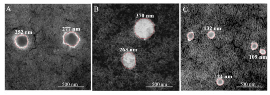 The diameter of AuCNPs dried at room temperature (Figure 5A), is in the range obtained from the DLS measurements. Their shape was not spherical but more like a drop spreading over a surface. Moreover, it can be seen that the adsorption contrast of the inner parts of AuCNP particles is not uniform, so they actually look like merged, smaller NPs. After heating at 200 °C and evaporation of EG/H2O (Figure 5B), there was no significant change in the diameter of the AuCNPs. In this case, we registered bright scattered signals over all the surfaces of the particles, which look like an inhomogeneous 2D agglomerate of smaller AuNPs. During the annealing at 550 °C (Figure 5C), the agglomerated NPs merged and formed globular AuCNPs with an average diameter of about 100 nm. In all three images, the AuNPs are embedded in a TiO2 film, the lower absorption contrast of which, in comparison with the AuNPs, causes its darker display on STEM images. During the subsequent heat treatment, volatile components are removed, and the film becomes more compact and thinner, and, as a result, its signal (Figure 5C) becomes more intense.
