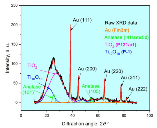 The XRD analysis of the TiO2/AuNP films is presented in Figure 6. The synthesized coatings were continuous homogeneous transparent polycrystalline films.