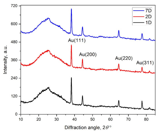 A pronounced halo in the low-angle region and a peak at the position 2θ = 25°371′ correspond to a superposition of diffraction reflections from three phases of titanium oxide: Ti10O18, TiO2, and anatase constituting 21, 75, and 4% of the matrix, respectively. The Ti10O18 and TiO2 phases are ultradisperse with a coherent scattering region (CSR) of 6 Å and 12 Å, respectively, the CSR of the anatase phase is 50 Å. Sharp, well-defined peaks in the diffractogram correspond, in angular positions, to the fcc gold phase. The CSR of this phase is 127 Å. Thus, according to the X-ray diffraction analysis data, the TiO2/AuNP film consists of three TiO2 phases, two of which are ultradisperse, and the fcc phase of AuNP. The aging stability of the ink and, as a consequence, the reproducibility of the printed films is the cornerstone of their applicability. The XRD analysis did not reveal a significant difference in the films printed with 1-, 2-, and 7-day-aged inks. The corresponding diffractograms are presented in Figure 7.