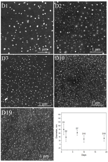 The agglomerates of AuNPs with mean sizes of 80 and 40 nm and a standard deviation (SD) of 30 nm were detected in the D1 and D2 films, respectively. Aging of the ink within seven days of preparation or more led to a significant decrease in the SD and an improvement of the AuNPs size distribution in the TiO2/AuNP films. The AuNP particles with mean sizes of 63, 29, and 33 nm with a SD of 15 nm were revealed in the films D7, D10, and D19, respectively. We emphasize that, within the measurement error, the mean sizes of AuNPs particles in TiO2/AuNP films printed with 10 and 19 day ink did not change and, on average, were equal to 30 nm. The size distribution and SD of the AuNP in the TiO2/AuNP films for the inks at the different storage time, restored from the corresponding SEM images, are presented in Figure 8. Importantly, note that regular monitoring of ink during storage and immediately before printing did not reveal sedimentation processes in them. The HDD of AuCNP particles in dispersion did not change, and the ink remained stable even four months after synthesis (see Supplementary Materials, Figure S5).