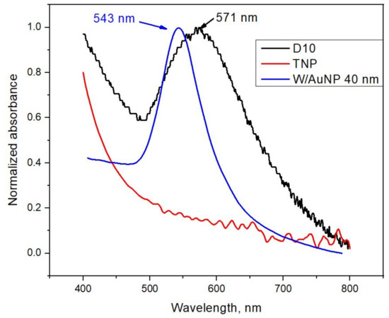 Normalized absorbance spectra of TiO2, D10 TiO2/AuNP ink-jet printed films, and 40 nm AuNPs dispersed in water [40].