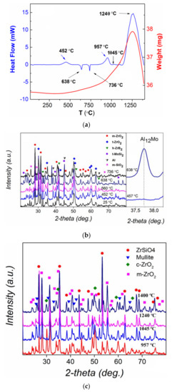 The microstructural evolution and phase transformation in the coating during annealing treatment from room temperature (~25 °C) to 1400 °C in normal atmosphere and pressure were also investigated. The TGA–DSC technique was employed to investigate and determine the precise onset temperature of phase transformations (Figure 3a). To understand the actual structural changes associated with the phase transformation reaction, XRD with in situ high-temperature experiments (HT–XRD) was also performed (Figure 3b,c).