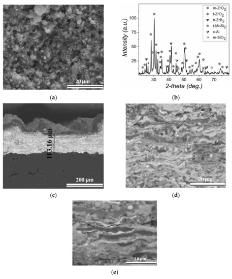 Figure 4 shows the results of the study of the microstructure and phase composition of the as-sprayed ZrB2–35MoSi2–10Al coating. The surface of the ZrB2–35MoSi2–10Al coating is rough and composed of a fully molten area and an insufficiently molten area (Figure 4a). These molten phases make un-melted particles stick together. There are no voids in the insufficiently molten area. Uniform dense coating was obtained (Figure 4c–e). The structure of the coating presents many lamellae piled up one upon another. Microcracks caused by internal residual stresses during the spraying process were not observed. The porosity of the obtained coating was 0.02–1.00%.