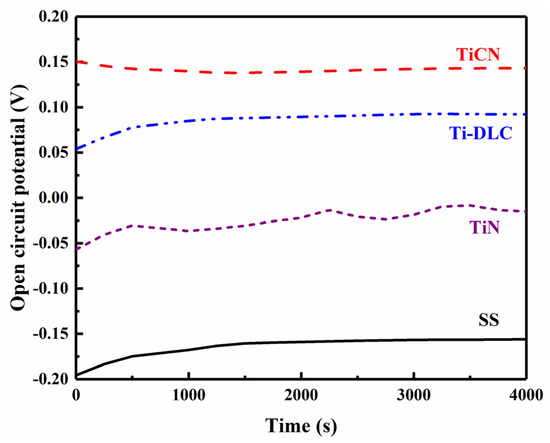 Figure 2 displays the OCP variation curves of the four samples in artificial saliva at 37 °C within 4000 s. According to the standard test method for measuring potentiodynamic polarization resistance, the basic stabilization value of OCP can be used as valid data after 55 min. The 316L SS substrate shows the most negative OCP (−0.156 V). In contrast, the three films have higher potentials, indicating that all the films can significantly enhance the corrosion resistance stability of 316L SS substrate. Among them, TiCN possess the most positive electrode potential (0.092 V) and highest stability. Moreover, the Ti-DLC film shows a slight negative deviation in the OCP value, indicating the inferior chemical stability of the coating. This phenomenon results in a dense surface structure and relatively high thickness of the TiCN film, yielding excellent electrochemical stability. Although Ti-DLC has the highest thickness, it contains many clusters that could have dissolved in the artificial saliva, leading to a negative deviation in the OCP value. The TiN film has a lower potential and larger fluctuation than other films. Its inferior chemical stability is because of its low thickness and several defects.